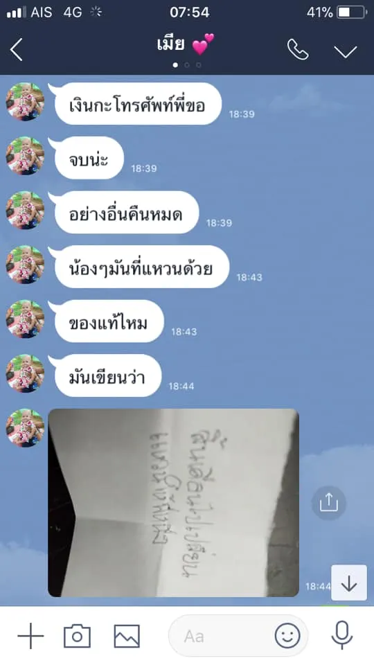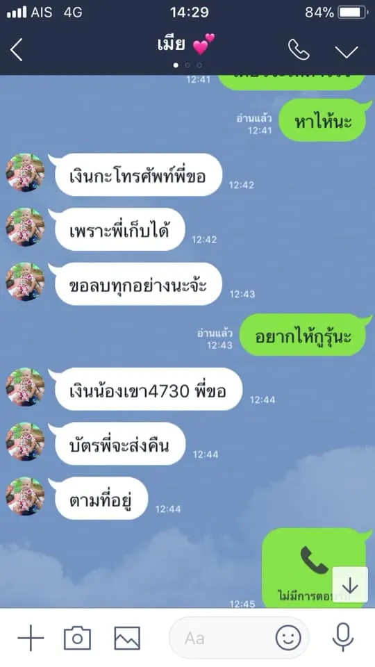 ผู้ใช้เฟซบุ๊ก หนึ่ง..... ได้แชร์ภาพบทสนทนาผ่านแชตไลน์ พร้อมระบุว่า เก็บของตนได้แล้วยังจะมาพูดแบบนี้อีก อยากเจอตัว และขอให้ตำรวจจับได้ด้วยเถอะ