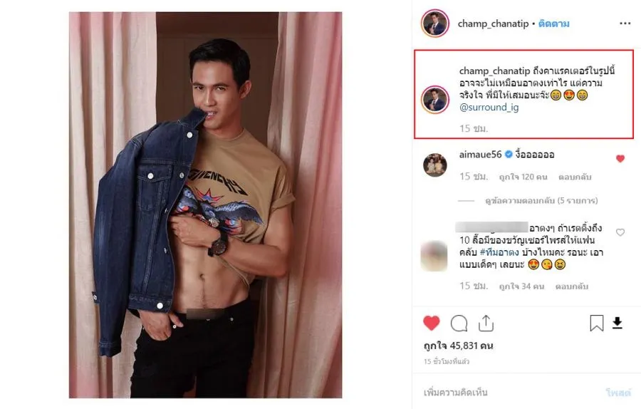 ล่าสุด อาตง ได้ออกมาโชว์ซิกแพคเบาๆเหมือนกัน ทำเอาสาวๆใจคอไม่ดีเลยละค่า ขนาดเน็ตไอดอลชื่อดังอย่าง เอม ตามใจตุ๊ด ยังเข้ามาคอมเม้นท์เลยว่า “งื้ออออออ” 555555