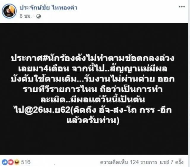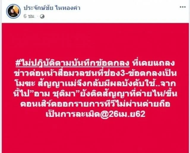 ยังคงเป็นเรื่องเป็นราวที่ไม่จบไม่สิ้นจริงๆสำหรับศึกระหว่างนายห้าง ประจักษ์ชัย ไหทองคำ และนักร้องสาว อาม ชุติมา ที่ตอนนี้ได้กลับมาประทุอีกรอบแล้วหลังก่อนหน้านี้ทั้งคู่ได้ตั้งโต๊ะแถลงประกาศฉีกสัญญาเก่าให้ อาม และร่างสัญญาใหม่ขึ้นภายใต้เงื่อนไข 9 ข้อ แต่สุดท้ายผ่านมา5เดือนเรื่องราวกับเป็นประเด็นขึ้นมาอีกครั้งเมื่อ ล่าสุด นายห้างประจักษ์ชัย ได้โพสต์เฟสบุ็คระบุข้อความว่า ประกาศนักร้องดังไม่ทำตามข้อตกลงล่วงเลยมา 4 เดือน จากนี้ไปสัญญาแม่มีผลบังคับใช้ตามเดิมรับงานไม่ผ่านค่ายออกทีวีรายการไหน ถือว่าเป็นการทำละเมิดมีผลแต่วันนี้เป็นต้นไป@26เม.ย.62(คิดถึง อัจ -สง-โถ กรรอีกแล้วครับท่าน นอกจานี้ ประจักษ์ชัย ยังได้โพสต์ข้อความต่ออีกว่า ไม่ปฎิบัติตามบันทึกข้อตกลง ที่เคยแถลงข่าวต่อหน้าสื่อมวลชน ที่ช่อง 3 ข้อตกลงเป็นโมฆะ สัญญาแม่จึงกลับมามีผลบังคับใช้..จากนี้ อาม ชุติมา ยังติดสัญญาที่ค่ายไหขึ้นคอนเสิร์ตออกรายการทีวีไม่ผ่านค่าย ถือเป็นการละเมิด@26เม.ย.62 งานนี้ทางด้านฝั่งของ สาวอาม ก็ได้งัดหลักฐานเด็ดออกมาโพสต์ชี้แจงถึงเรื่องที่เกิดขึ้นว่า สาเหตุที่หนูไม่อยากให้คิววันเสาร์ นะคะ (ย้ำนะคะ วัน ศุกร์ กับ วันเสาร์ ) ถ้าเป็นวัน จันทร์ – ศุกร์ คุณก็ไม่เอา และหนูก็ไม่ได้ผิดสัญญาอะไรนะคะ บางทีเอาคิวไป พอถึงวันก็ไม่มีงานให้ ไม่สนใจ เงินก็ไม่ให้ซักบาท อยากได้วันเสาร์ 5 คิวต่อเดือน แต่วันเสาร์ 1 เดือนมี 4 วัน