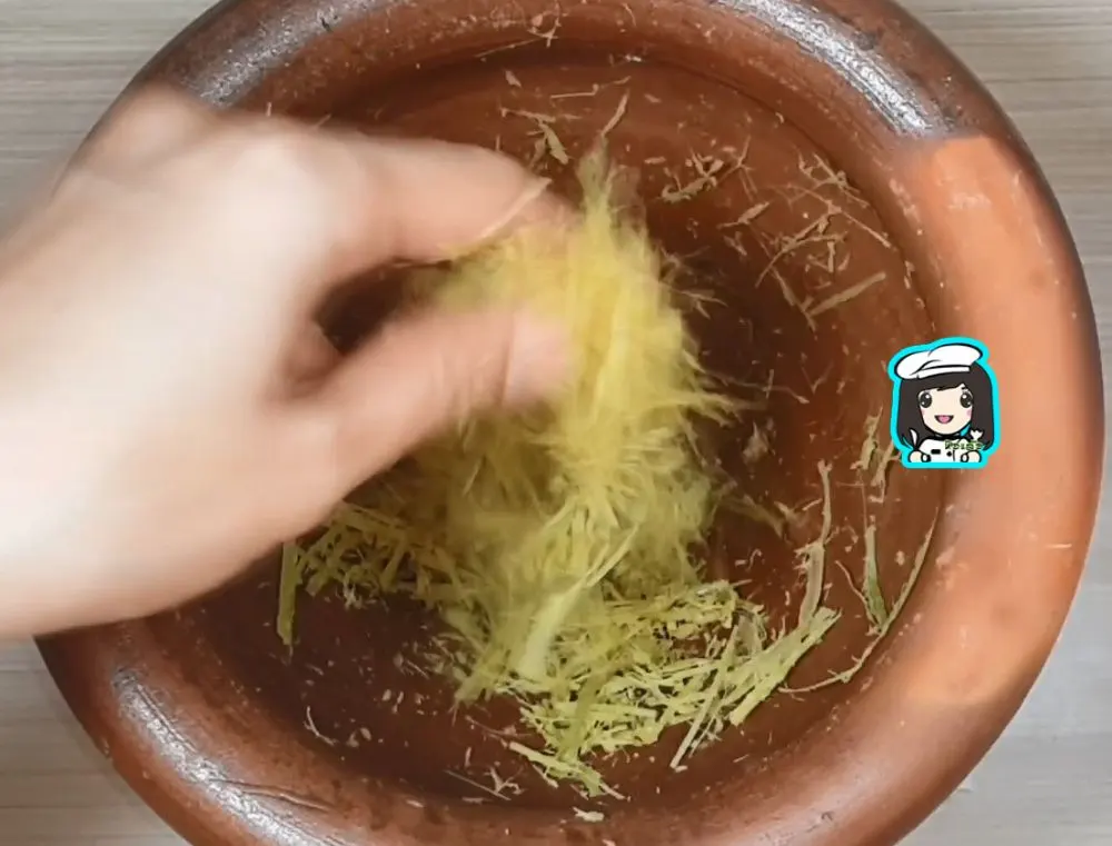 ใส่ครกโขลกจนแหลก ใช้มือสางให้เส้นตะไคร้ขึ้นฟู