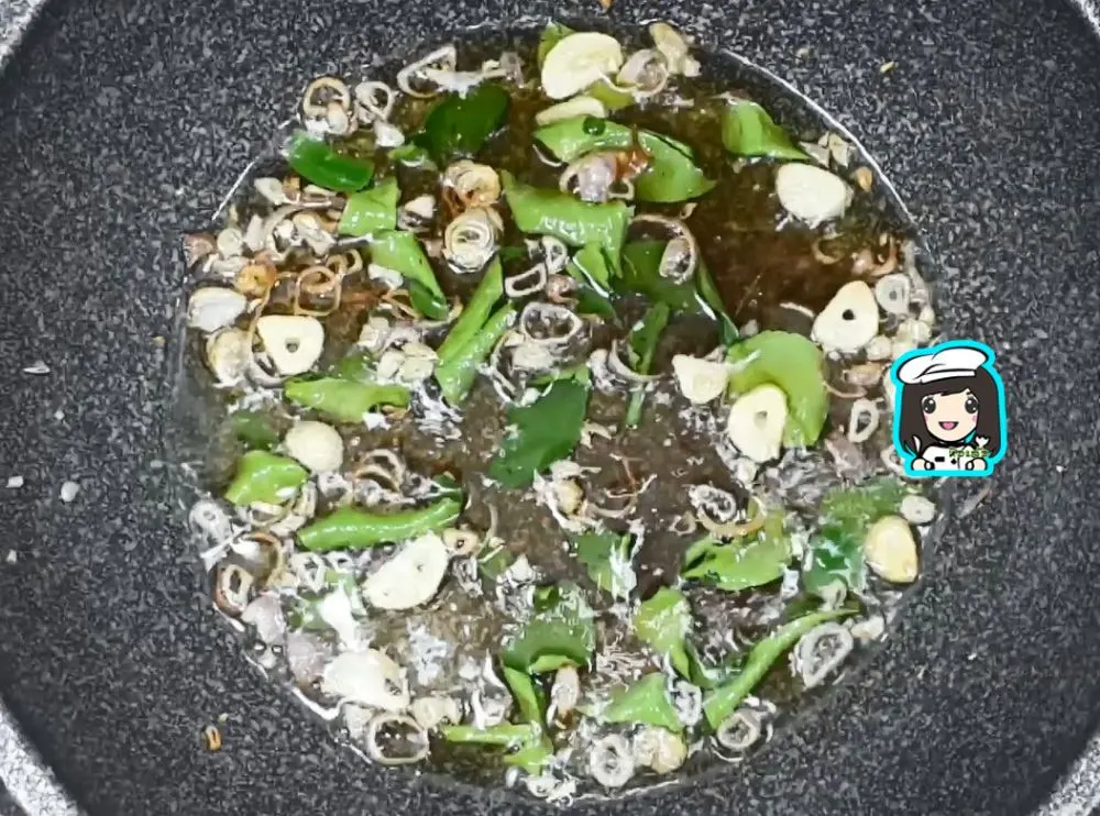 2.ซอยหอมแดง กระเทียม ใบมะกรูด ลงทอดต่อจากตะไคร้ พักให้สะเด็ดน้ำมัน