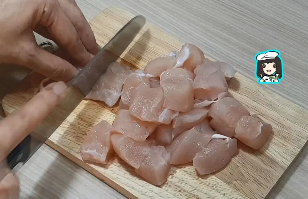 3.หั่นเนื้อไก่เป็นเต๋าชิ้นพอคำ