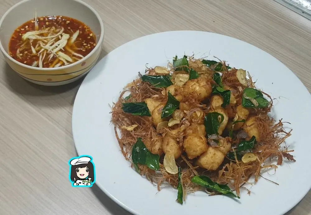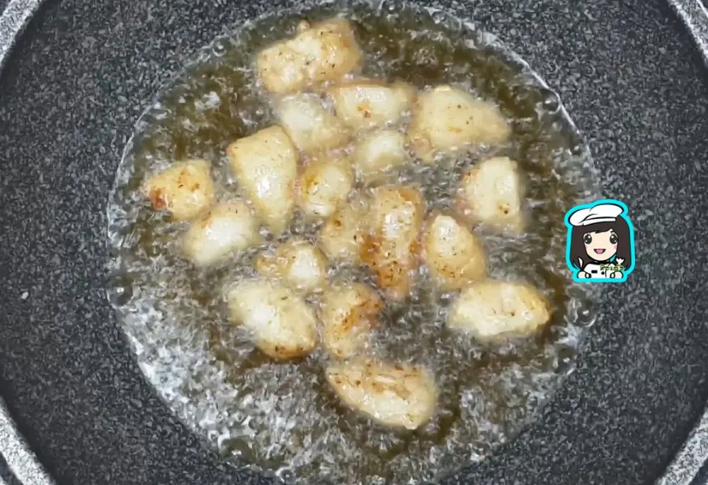 คลุกกับผงปรุงรสและแป้งทอดกรอบบางๆ ลงทอดให้เหลืองกรอบ พักไว้