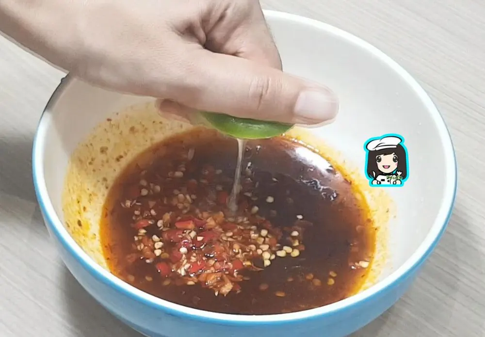 4.ปรุงน้ำยำ น้ำพริกเผา น้ำเชื่อม น้ำปลา น้ำมะนาว พริกสับหยาบ คนให้ส่วนผสมเข้ากัน ชิมรสตามชอบ