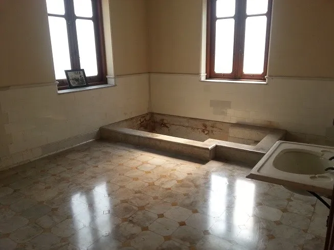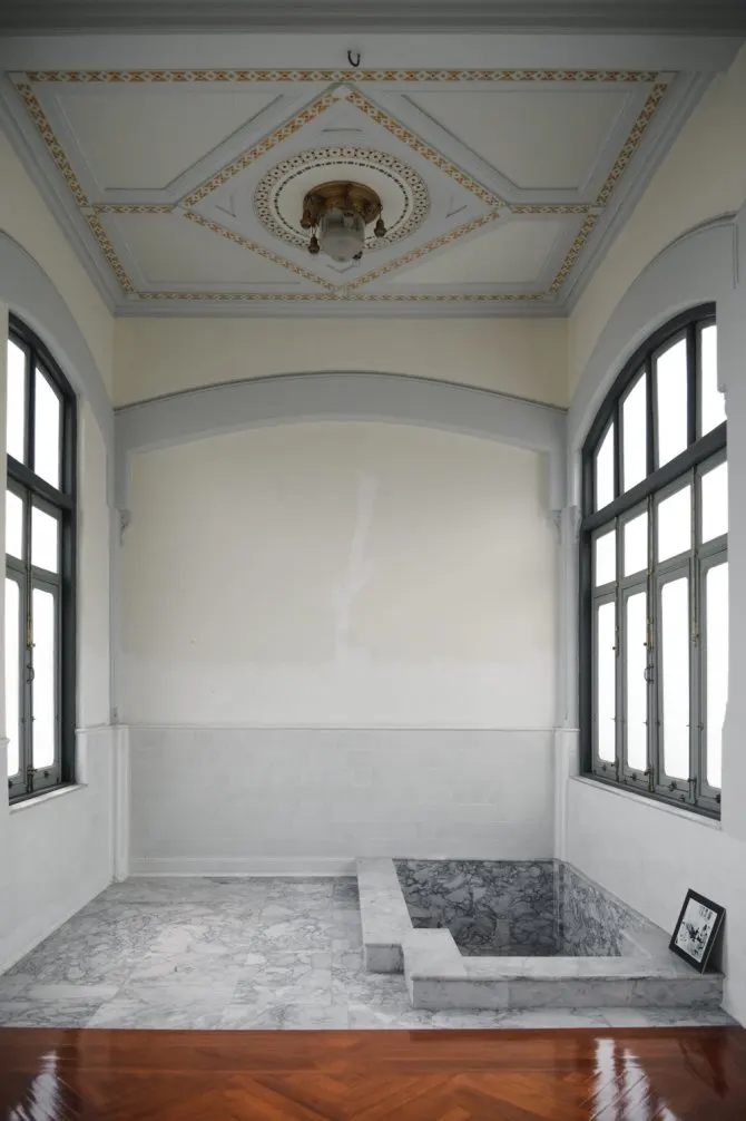 ภายในห้องน้ำ ก็เป็นบ่อน้ำสไตล์โรมันเช่นกัน ทำด้วยหินอ่อนและหินแกรนิต (สมัยนั้นนำเข้าจากอิตาลี) แต่เดิมจะมีช่องส่งน้ำจากริมคลองอ่างหยกปล่อยน้ำเพื่อสรงน้ำ และระบายน้ำทิ้ง