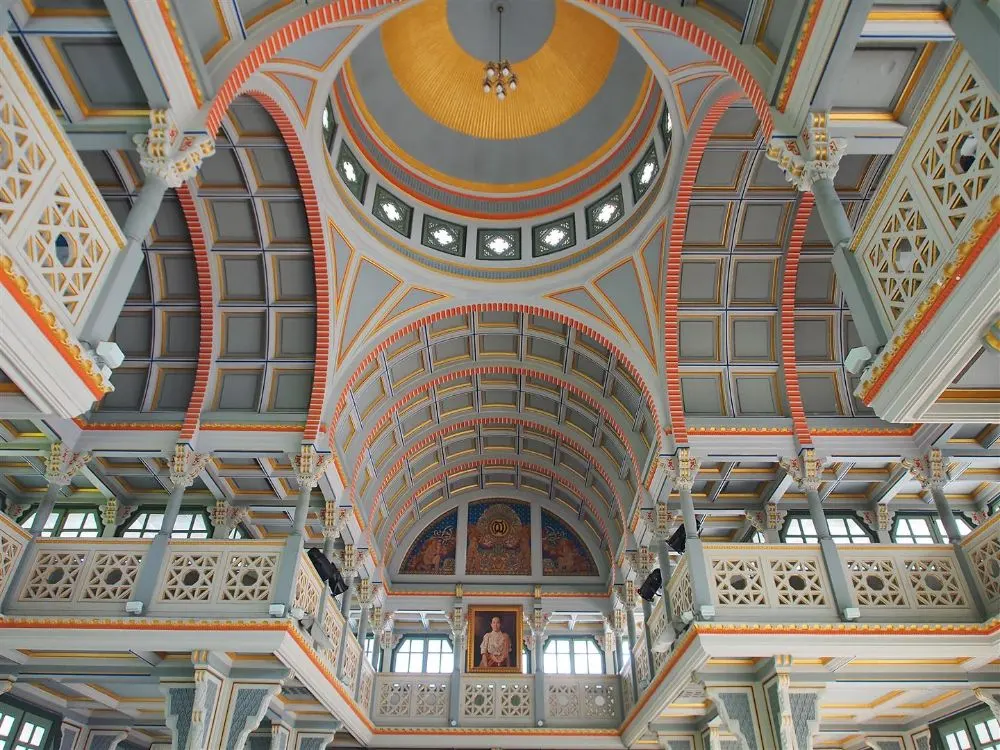 พระที่นั่งเทวราชสภารมย์ ลักษณะท้องพระโรงได้รับอิทธิพลมาจากสถาปัตยกรรมแบบไบเซ็นไทน์ มีโดมอยู่ตรงกลางรับด้วยหลังคาโค้งประทุน ๔ ด้าน