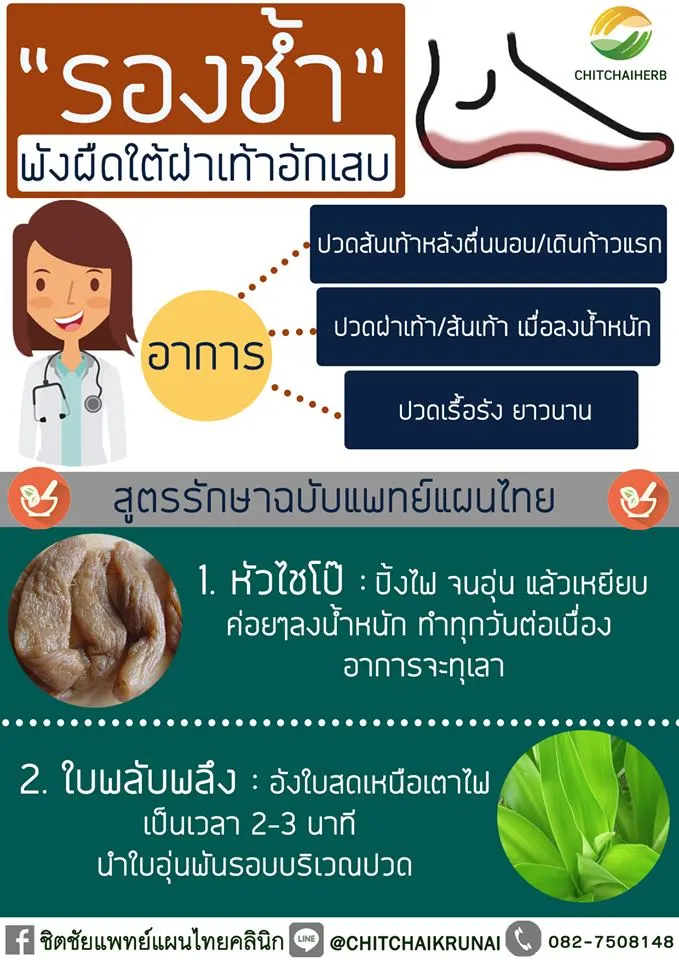 1. หัวไชโป๊ : หัวไชโป๊(เค็ม) ด้วยรสเค็มสามารถซึมซาบเข้าผิวหนังได้ดีและยังรักษาความร้อนได้นานอีกด้วย และยังเป็นความพอดีของหัวไชโป๊ที่มีลักษณะกรอบอ่อนนุ่ม ไม่แข็งจนเกินไป นำมาไปปิ้งไฟ จนอุ่น จากนั้นนำเท้าเหยียบไปบนหัวไชโป๊ค่อยๆลงน้ำหนักไปเรื่อยๆ จะช่วยบรรเทาอาการปวด อักเสบใต้ฝ่าเท้าได้ดี ทำประจำทุกวันต่อเนื่อง อาการจะค่อยๆทุเลา