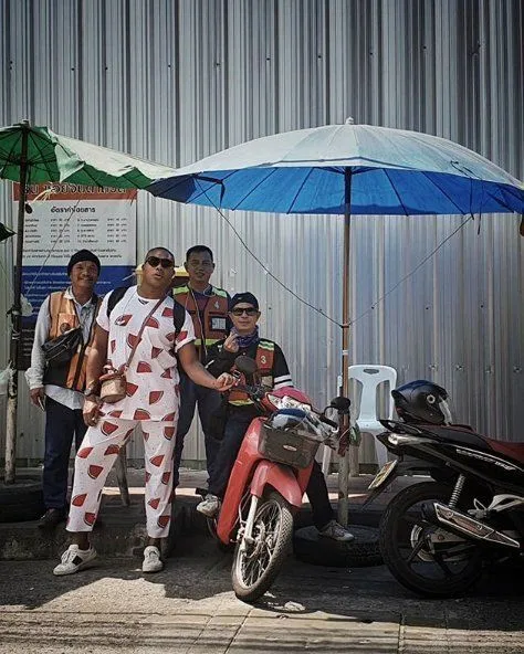 และยิ่งภาพล่าสุดที่ก็สามารถสร้างเสียงหัวเราะออกมาได้ไม่แพ้กัน นั่นก็ภาพของเธอที่ไปยืนถ่ายรูปอยู่กับเหล่าแก๊งของพี่วินมอเตอร์ไซด์ แต่อยากจะให้โฟกัสในชุดของเธอเพราะมันคือชุดลายแตงโมที่เรียกว่า เอ่อ...ชุดน่ารักมากๆ เลยนะคะสาวแข