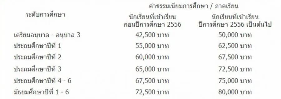 ค่าธรรมเนียนการศักษา / ภาคเรียน เตรียมอนุบาล – อนุบาล 3 ค่าธรรม 50,000 บาท ประถมศึกษาปีที่ 1 ค่าธรรมเนียน 62,500 บาท ประถมศึกษาปีที่ 2 ค่าธรรมเนียน 67,500 บาท ประถมศึกษาปีที่ 3 ค่าธรรมเนียน 72,500 บาท ประถมศึกษาปีที่ 4 – 6 ค่าธรรมเนียน 75,000 บาท มัธยมศึกษาปีที่ 1 – 6 ค่าธรรมเนียน 80,000 บาท ไม่รวยจริงๆเรียนไม่ได้นะเนี่ย งานนี้แม่ตั๊กจ่ายให้ลูกชายได้อย่างสบายๆ