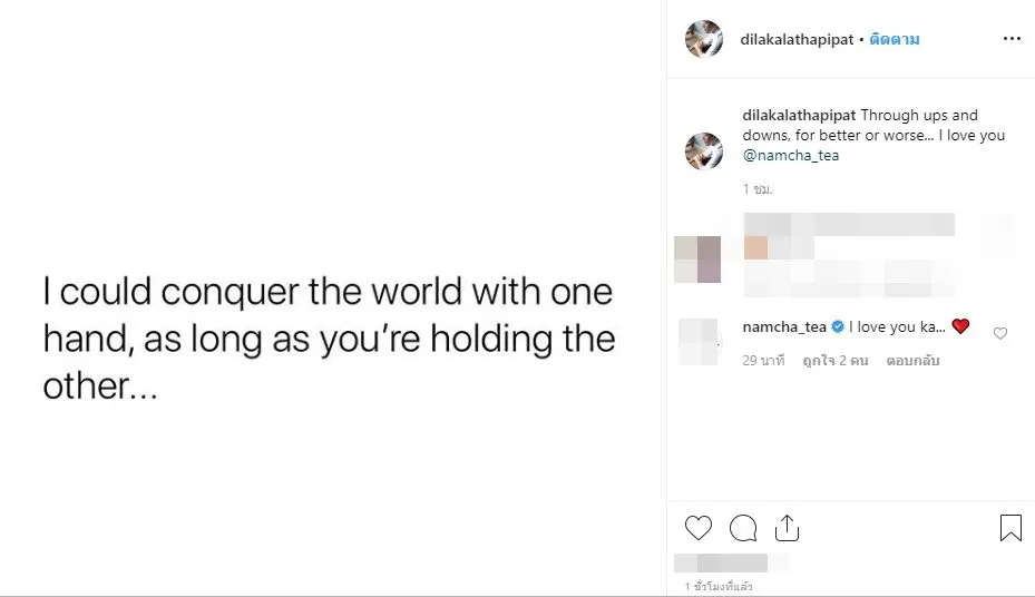 เเคปชั่นต์ ของ เจ้าตัว..Through ups and downs, for better or worse… I love you @namcha_tea