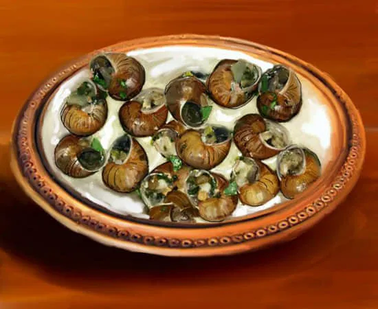 อาหารโปรดอีกจานของผู้ดีโรมัน ได้แก่ หอยทาก ซึ่งพวกเขาจะเลี้ยงหอยทากด้วยนมสดและเมื่อนำมาปรุงเป็นอาหาร พ่อครัวจะเอาหอยทากไปวางบนชิ้นเนื้อดิบเพื่อให้หอยดูดกินน้ำเนื้อจนบวมเป่ง กลับเข้าไปในเปลือกไม่ได้ จากนั้น จะนำเนื้อหอยทากไปทอดด้วยไฟอ่อนๆ แล้วเสิร์ฟพร้อมซอสปลากับไวน์ขาว
