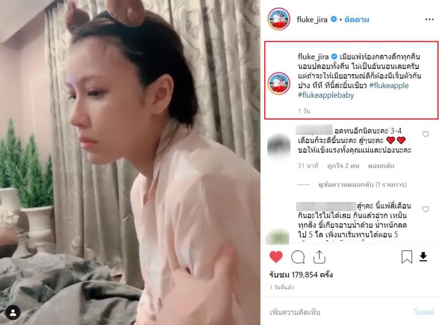 ล่าสุด หนุ่มฟลุคได้ออกมาโพสต์คลิปภรรยาที่แพ้ท้องหนักและลุกขึ้นมาร้องไห้กลางดึก พร้อมแคปชั่นว่า “เมียแพ้ท้องกลางดึกทุกคืน นอนปลอบทั้งคืน ไม่เป็นอันนอนเลยครับ แต่ถ้าจะให้เมียอารมณ์ดีก็ต้องมีเจ็บตัวกันบ้าง หึหึ ทีนี้ล่ะยิ้มเชียว #flukeapple #flukeapplebaby” งานนี้แฟนๆคลับและคนในวงการได้เข้ามาแสดงความเห็นเป็นจำนวนมาก