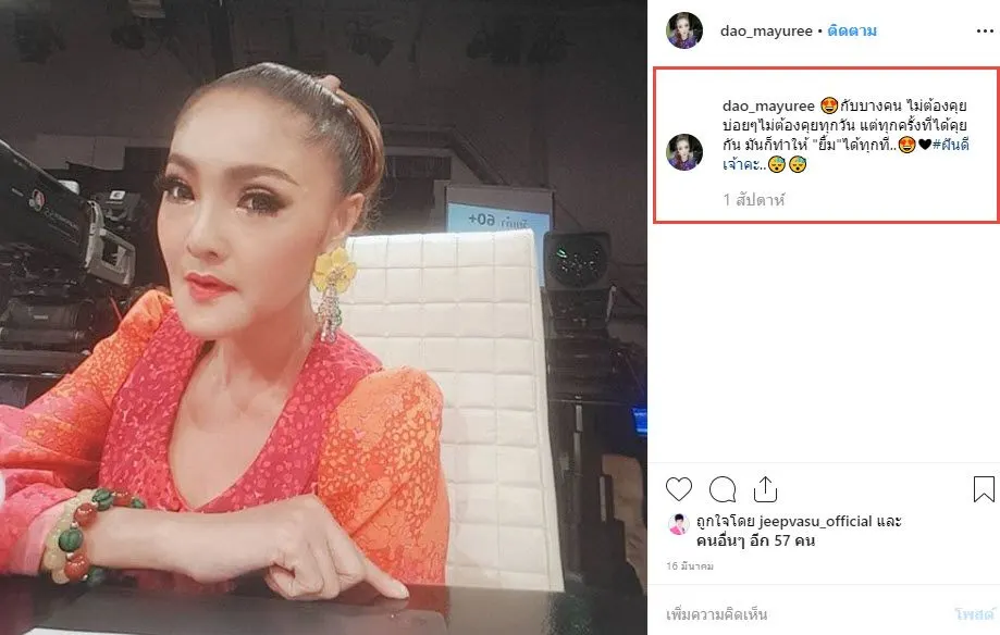 อีกทั้งผู้สื่อข่าวยังได้ถามถึงเรื่องข้อความหวานๆ ของเจ้าตัวที่โพสต์ลงในอินสตาแกรมส่วนตัวระบุว่า "กับบางคน ไม่ต้องคุยบ่อยๆไม่ต้องคุยทุกวัน แต่ทุกครั้งที่ได้คุยกัน มันก็ทำให้ "ยิ้ม"ได้ทุกที..#ฝันดีเจ้าคะ.."