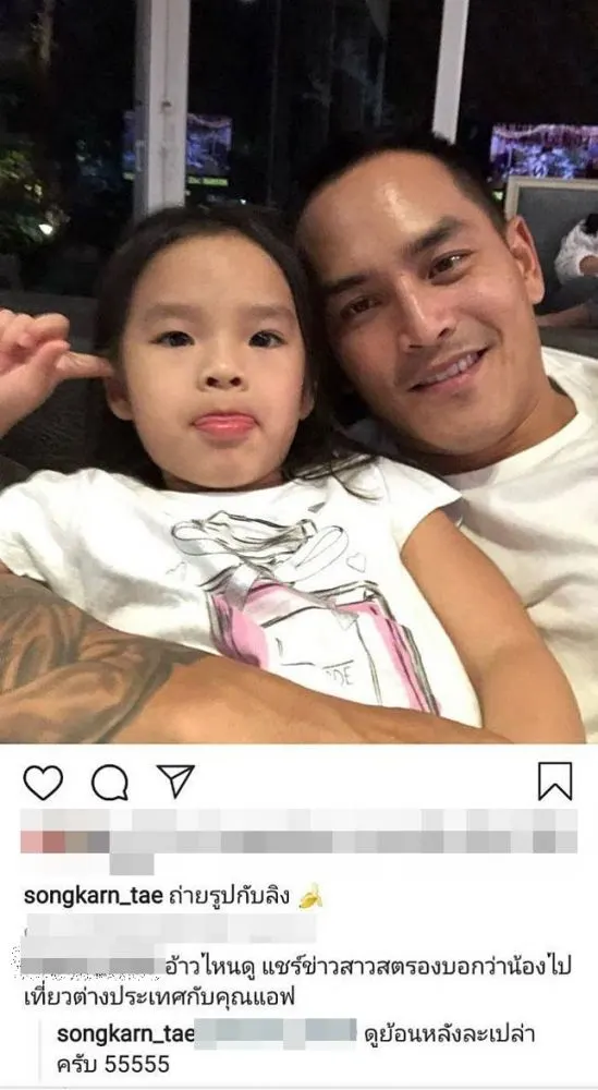 โดยงานนี้ หนุ่มสงกรานต์ ได้ตอบกลับชาวเน็ตรายหนึ่งเข้ามาคอมเมนท์ถามด้วยความสงสัย หลังจากที่เจ้าตัวลงรูปดังกล่าวคู่กับลูกสาวว่า “อ้าวไหนดู แชร์ข่าวสาวสตรอง บอกว่าน้องไปเที่ยวต่างประเทศกับคุณแอฟ” ซึ่ง หนุ่มสงกรานต์ ก็ได้เข้ามาตอบกลับว่า“ดูย้อนหลังละเปล่าครับ 55555”**