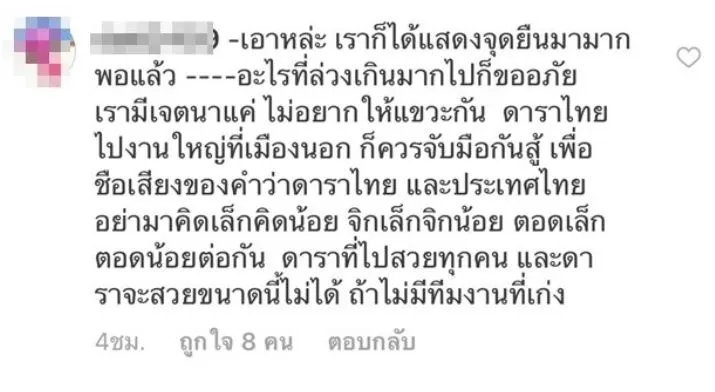 “พูดจาได้น่ารังเกียจมาก ทำราวกับว่าดาราที่ตนเชียร์ดีเด่นกว่าคนอื่น จำปีที่ดาราที่รักของหล่อนไม่อยู่ในสายตาของเจ้าหน้าที่ แล้วเค้าเปิดที่กั้นให้คนเดินเข้างานแบบไม่มีใครสนใจในชุดที่กำลัง present ได้ไม๊ จ๋อยรับประทาน ร้องไห้ตาแตก ที่สำคัญ การที่ไปนี่ คือไปในฐานะพรีเซนเตอร์ เหมือนกับดาราคนอื่นๆ ที่ไปนั่นแหละ ดาราคนนี้เคยมีงานหนังทั้งในประเทศไทย และต่างประเทศที่ประสบความสำเร็จไม๊? อย่าว่าแต่ไปเล่นหนังต่างประเทศเลย ขนาดหนังไทยที่เล่น ก็รายได้ต่ำเตี้ยเรี่ยดิน การที่เราจะเชียร์คนที่เราชื่นชอบ (เพราะเค้าเป็นนายจ้างเรา) ไม่ใช่เรื่องผิด เป็นเรื่องธรรมดา แต่อย่าเชียร์แล้วไปพูดเหยียดดาราคนอื่น การพยายามขึ้นที่สูงโดยการเหยียบผู้อื่นให้ต่ำ เป็นการกระทำของคนโง่ที่ไม่มีวุฒิภาวะ” แน่นอนว่าหลังจากเจอคอมเม้นนักข่าวไปแต่งหน้าคนละก้าวถึงกลับไม่กลับสักทีว่า “อย่าซีเรียส คนอื่นที่ไปก็ลูกสาวหมด ไม่ได้ว่าใคร ทำใจดีๆนะครับ ผมพูดขำๆ ถ้าทำให้เข้าใจผิดขอโทษด้วยนะครับ , ขอโทษด้วยนะครับ ที่อาจจะไปแทงใจดำ ว่าแต่ว่าใครเอ่ยยยยยย ถุยยยยยย”