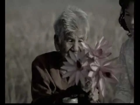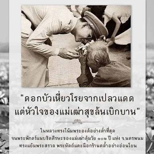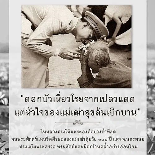 แม่เฒ่าตุ้ม จันทนิตย์ วัย ๑๐๒ ปี แห่ง จังหวัดนครพนม ขอให้หลานอุ้มใส่รถลากเฝ้ารับเสด็จพร้อมดอกบัวสีชมพู เปลวแดด แผดเผาจนดอกบัวสายเหี่ยวโรย แต่หัวใจภักดีของหญิงชรายังคงเบิกบาน เมื่อเสด็จมาถึงตรงหน้า