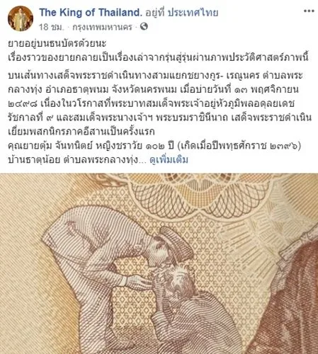 ยายอยู่บนธนบัตรด้วยนะ แม่เฒ่าตุ้ม วัย ๑๐๒ ปี ที่ในหลวง ร.๙ ทรงโน้มพระองค์ จนพระพักตร์แนบชิดศีรษะของแม่เฒ่า ทรงแย้มพระสรวล พระหัตถ์แตะมือกร้านคล้ำอย่างอ่อนโยน