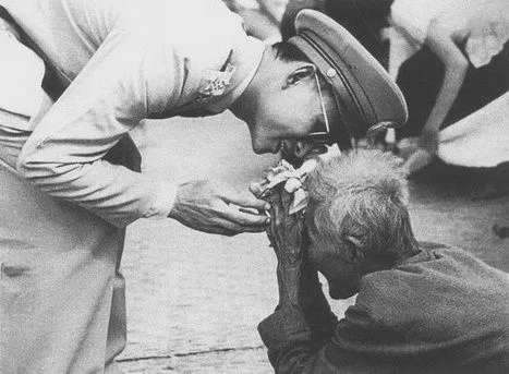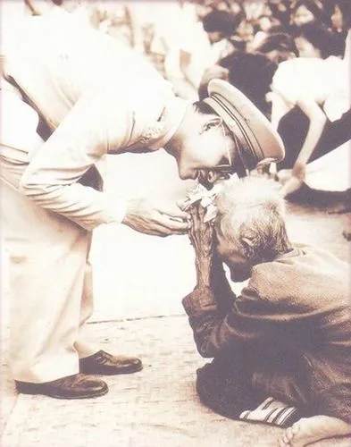 พระเจ้าแผ่นดินทรงโน้มพระองค์อย่างต่ำที่สุด จนพระพักตร์แนบชิดกับศีรษะของแม่เฒ่า แย้มพระสรวลอย่างเอ็นดูพระหัตถ์แตะมือกร้านคล้ำของเกษตรกรชราชาวอีสานอย่างอ่อนโยน ไม่มีใครรู้ว่าทรงกระซิบคำใดกับแม่