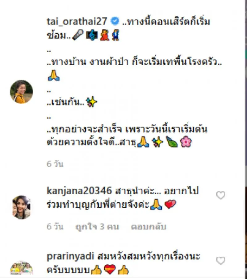 “ต่าย อรทัย ทางนี้คอนเสิร์ตก็เริ่มซ้อม….ทางบ้าน งานผ้าป่า ก็จะเริ่มเทพื้นโรงครัว เช่นกัน ทุกอย่างจะสำเร็จ เพราะวันนี้เราเริ่มต้นด้วยความตั้งใจดี..สาธุ”