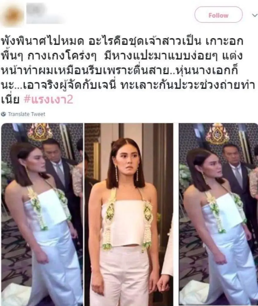“สาบานว่าชุดแต่งงาน??อีเว…ชุดแขกในงานยังสวยกว่าเจ้าสาว โอ๊ยน๊อออ บทพังแล้วคอสตูมยังพังอีก ลาก่อน #แรงเงา2”“พังพินาศไปหมด อะไรคือชุดเจ้าสาวเป็น เกาะอกพื้นๆ กางเกงโคร่งๆ มีหางแปะมาแบบง่อยๆ แต่งหน้าทำผมเหมือนรีบเพราะตื่นสาย..หุ่นนางเอกก็นะ…เอาจริงผู้จัดกับเจนี่ ทะเลาะกันปะวะช่วงถ่ายทำเนี่ย #แรงเงา2”