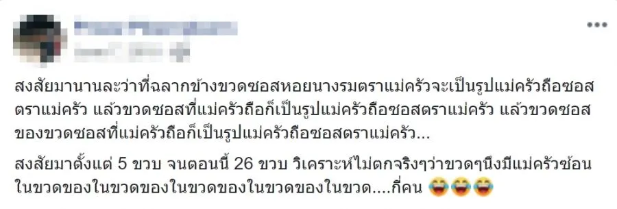 “สงสัยมานานละว่าที่ฉลากข้างขวดซอสหอยนางรมตราแม่ครัวจะเป็นรูปแม่ครัวถือซอสตราแม่ครัว แล้วขวดซอสที่แม่ครัวถือก็เป็นรูปแม่ครัวถือซอสตราแม่ครัว แล้วขวดซอสของขวดซอสที่แม่ครัวถือก็เป็นรูปแม่ครัวถือซอสตราแม่ครัว… สงสัยมาตั้งแต่ 5 ขวบ จนตอนนี้ 26 ขวบ วิเคราะห์ไม่ตกจริงๆ ว่าขวดๆ นึงมีแม่ครัวซ้อนในขวดของในขวดของในขวดของในขวดของในขวด….กี่คน”