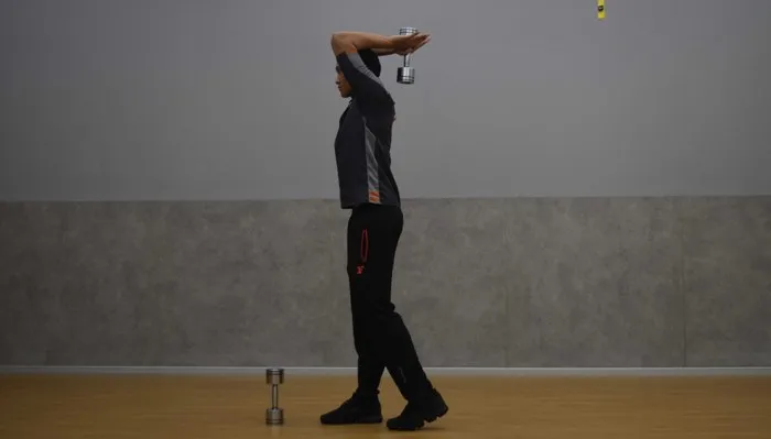 3.ท่า Overhead Triceps Extension ท่าบริหารนี้จะช่วยให้หลังแขนกระชับ โดยเราจะต้องมีอุปกรณ์ช่วย คือ ดัมเบล หรือเราสามารถใช้ขวดน้ำแทนได้ เราจะต้องยืนตรงแยกขาเล็กน้อยใช้มือทั้งสองข้างจับดัมเบล เหยียดแขนขึ้นเหนือศีรษะ โดยข้อศอกจะอยู่แนบชิดกับหู ค่อยๆยกดัมเบลไปด้านหลังช้าๆ ทำทั้งหมด 3 เซต เซตละ 12-15 ครั้ง ระหว่างเซตพัก 1 นาที