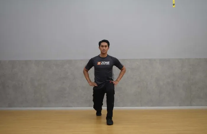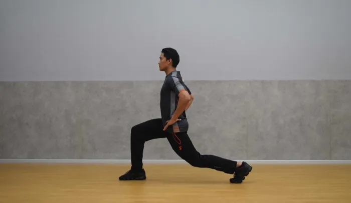 2. ท่า Lunges เป็นท่าบริหารกล้ามเนื้อบริเวณต้นขาด้านหน้าและบริเวณสะโพก โดยเราจะต้องจัดท่าทางให้ถูกต้อง เริ่มจากยืนเท้ากว้างเท่าช่วงสะโพก ก้าวขาข้างใดข้างหนึ่งออกไปด้านหน้าระยะประมาน 2 ก้าวปกติ ย่อตัวลงตรงๆ โดยให้หัวเข่าทำมุม 90 องศา ไม่โน้มตัวไปด้านหน้า แทงเข่าด้านหลังลง และระวังไม่ให้เข่าด้านหน้าเลยปลายเท้า ทำทั้งหมด 3 เซต เซตละ 12 ครั้ง ระหว่างเซตพัก 40 วินาที
