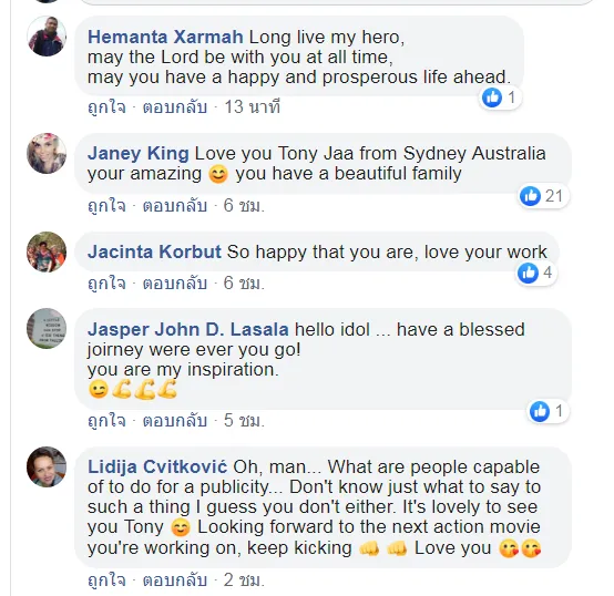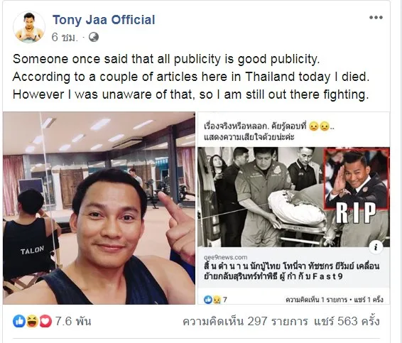 จาพนม ยีรัมย์ หรือโทนี่จา ออกมาโพสต์ข้อความ และคลิปในเฟสบุค ว่ามีคนเคยพูดไว้ว่าการประชาสัมพันธ์สู่สาธารณะเป็นเรื่องที่ดี แต่กลับว่าไปออกข่าวว่าผมตายแล้วในประเทศไทยวันนี้ ผมงงมากไม่รู้เรื่องนี้เลย ผมยังไม่ตายตามข่าวลือ ข่าวปลอมที่ปล่อยออกมา ผมจะคงยืนหยัดต่อสู้ตรงนี้ต่อไป...