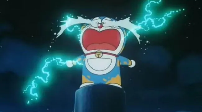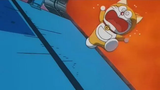 7. เนื่องจากเกิดอุบัติเหตุการไล่ล่าโจรกาลเวลา ทำให้ไฟฟ้าลัดวงจรใส่โดราเอมอนและร่วงลงมาจากโรงงานการผลิตจนเกือบถูกเผาในเตาหลอม