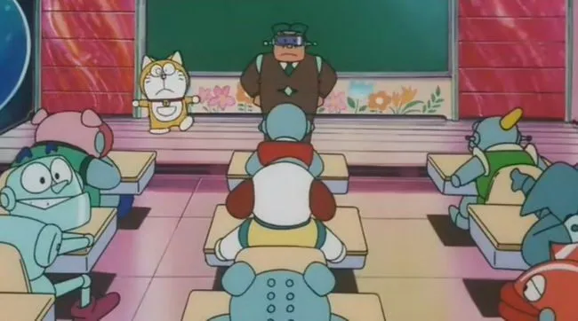 9. ผลข้างเคียงจากอุบัติเหตุ ทำให้โดราเอมอนเพี้ยนๆ ต่างจากหุ่นแมวตัวอื่นๆ และถูกจับไปเรียนห้องพิเศษ จนได้พบกับโนราเมียโกะอีกครั้ง พร้อมกับเพื่อนๆ คนอื่นอีกด้วย