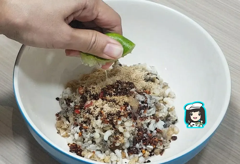 2.เตรียมชามใบใหญ่ ใส่ไข่มดแดงลงไป ตามด้วย พริกป่น พริกซอย ข้าวคั่ว น้ำปลา น้ำมะนาว