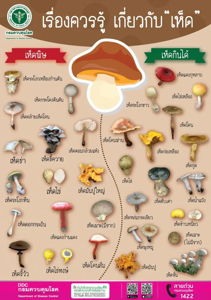 กระทรวงสาธารณะสุขยังได้ออกมาแนะนำด้วยแผนรูปภาพเพื่อง่ายต่อการเข้าใจ ว่าเห็ดอะไรเป็นเห็ดพิษ เห็ดอะไรกินได้หรือกินไม่ได้บ้าง เซฟรูปเก็บไว้เลยค่ะ