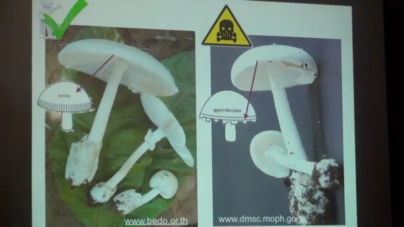 จากรูปจะเห็นว่าเห็ดมีพิษที่กินไม่ได้ (ฝั่งซ้าย) เมื่อเข้าสู่ร่างกายจะทำลายเนื้อเยื่อตับ ไต ระบบทางเดินอาหาร ระบบเลือด ระบบหายใจ ระบบประสาท และอาจทำให้เสียชีวิตได้