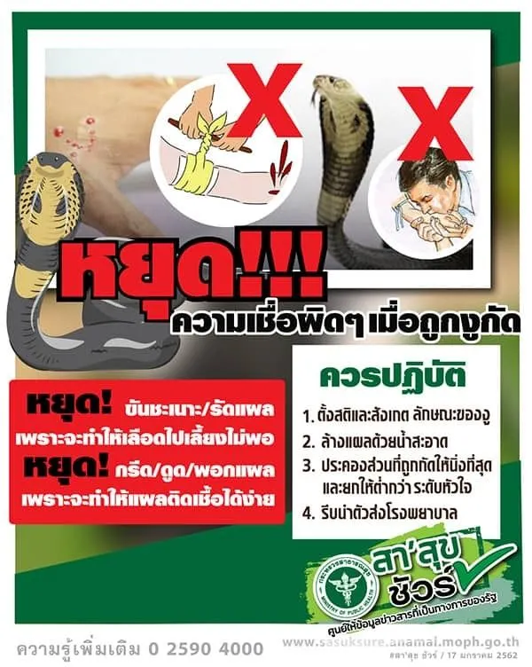 “ยังมีประชาชนจำนวนไม่น้อยที่เข้าใจผิดว่า หากถูกงูกัดให้กรีดแผล ใช้ไฟจี้แผล ใช้ปากดูดพิษงูออกจากแผล หรือพอกยา พอกสมุนไพรในแผลที่ถูกงูกัด