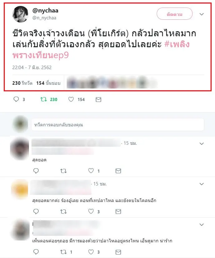 เพราะทั้งคู่ใส่ไม่ยั้ง อีกคนก็ดูแค้นจริง ส่วนอีกคนก็ดูกลัวจริงเรียกได้ว่าเรียลสุดๆและไม่ใช่แค่นั้น เพราะความจริงแล้วเบื้องหลัง โยเกิร์ตเป็นคนที่กลัวปลาไหลมาก !! แต่ต้องมาเข้าฉากกับปลาไหลจริงๆ โอ้โห เห็นแล้วต้องขอชื่นชมและปรบมือให้กับสปิริตนักแสดงเลย