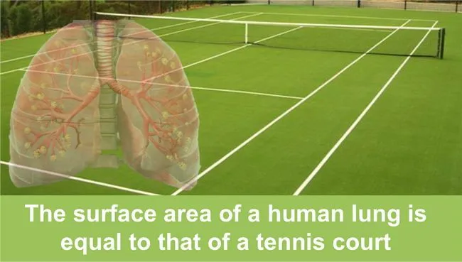 9. ส่วนพื้นผิวของปอดมนุษย์เรา เมื่อขยายออกมาจะมีความกว้างพอๆ กับสนามเทนนิส 1 สนาม