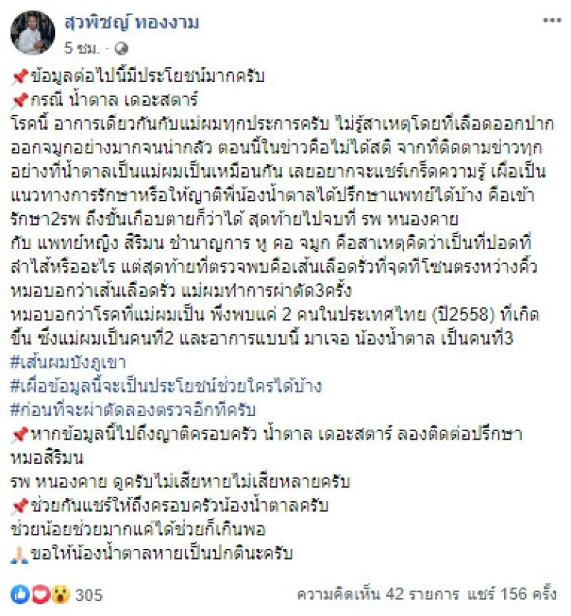 ล่าสุด สุวพิชญ์ ทองงาม โพสต์ข้อความว่า ข้อมูลต่อไปนี้มีประโยชน์มากครับกรณี น้ำตาล เดอะสตาร์โรคนี้ อาการเดียวกันกับแม่ผมทุกประการครับ ไม่รู้สาเหตุโดยที่เลือดออกปากออกจมูกอย่างมากจนน่ากลัว ตอนนี้ในข่าวคือไม่ได้สติ จากที่ติดตามข่าวทุกอย่างที่น้ำตาลเป็นแม่ผมเป็นเหมือนกัน เลยอยากจะแชร์เกร็ดความรู้ เผื่อเป็นแนวทางการรักษาหรือให้ญาติพี่น้องน้ำตาลได้ปรึกษาแพทย์ได้บ้าง คือเข้ารักษา2รพ ถึงขั้นเกือบตายก็ว่าได้ สุดท้ายไปจบที่ รพ หนองคายกับ แพทย์หญิง สิริมน ชำนาญการ หู คอ จมูก คือสาเหตุคิดว่าเป็นที่ปอดที่ลำไส้หรืออะไร แต่สุดท้ายที่ตรวจพบคือเส้นเลือดรั่วที่จุดทีโซนตรงหว่างคิ้ว หมอบอกว่าเส้นเลือดรั่ว แม่ผมทำการผ่าตัด3ครั้ง หมอบอกว่าโรคที่แม่ผมเป็น พึ่งพบแค่ 2 คนในประเทศไทย (ปี2558) ที่เกิดขึ้น ซึ่งแม่ผมเป็นคนที่2 และอาการแบบนี้ มาเจอ น้องน้ำตาล เป็นคนที่3