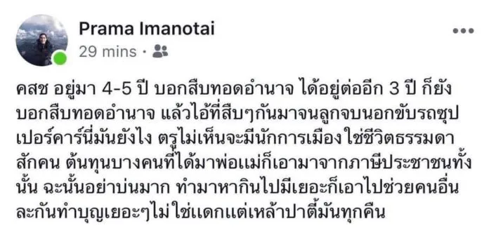 เมื่อวันที่ 6 มิ.ย. นายปรมะ อิ่มอโนทัย หรือ ปั้นจั่น อดีตบอยแบนด์วง ไนซ์ ทู มีท ยู และ นักแสดงชื่อดัง ได้โพสต์แสดงความคิดเห็นผ่านเฟซบุ๊กส่วนตัว ถึงกรณีสถานการณ์การเมืองในประเทศไทยเวลานี้ โดยระบุข้อความว่า “คสช. อยู่มา 4-5 ปี บอกสืบทอดอำนาจ ได้อยู่ต่ออีก 3 ปี ก็ยังบอกสืบทอดอำนาจ แล้วไอ้ที่สืบๆกันมาจนลูกจบนอกขับรถซุปเปอร์คาร์นี่มันยังไง ตรูไม่เห็นจะมีนักการเมืองใช้ชีวิตธรรมดาสักคน” “ต้นทุนบางคนที่ได้มาพ่อแม่ก็เอามาจากภาษาประชาชนทั้งนั้น ฉะนั้นอย่าบ่นมาก ทำมาหากินไป มีเยอะก็เอาไปช่วยคนอื่นละกัน ทำบุญเยอะๆไม่ใช่แดกแต่เหล้าปาร์ตี้มันทุกคืน” อย่างไรก็ตามต่อมาเจ้าตัวได้ลบโพสต์ดังกล่าวออกจากเฟซบุ๊กไปเป็นที่เรียบร้อย