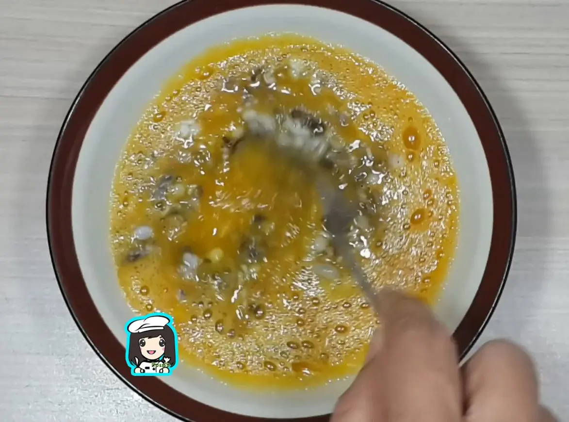 2.ตอกไข่ไก่ใส่ชาม ปรุงรสด้วยน้ำปลา น้ำมันหอย