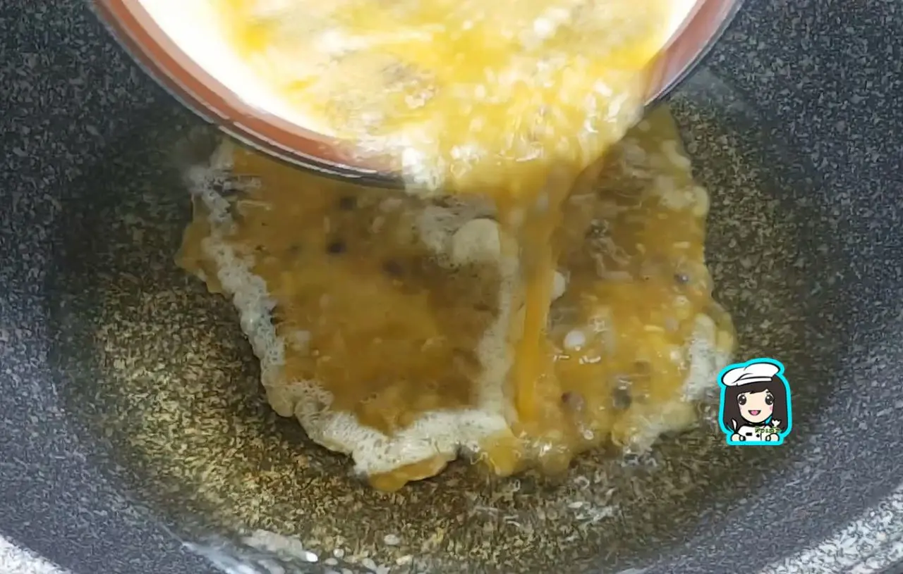 3.ตั้งกระทะให้ร้อนใส่น้ำมันลงไปกะให้ท่วมไข่ น้ำมันร้อนใส่ไข่ที่ตีไว้ลงไป