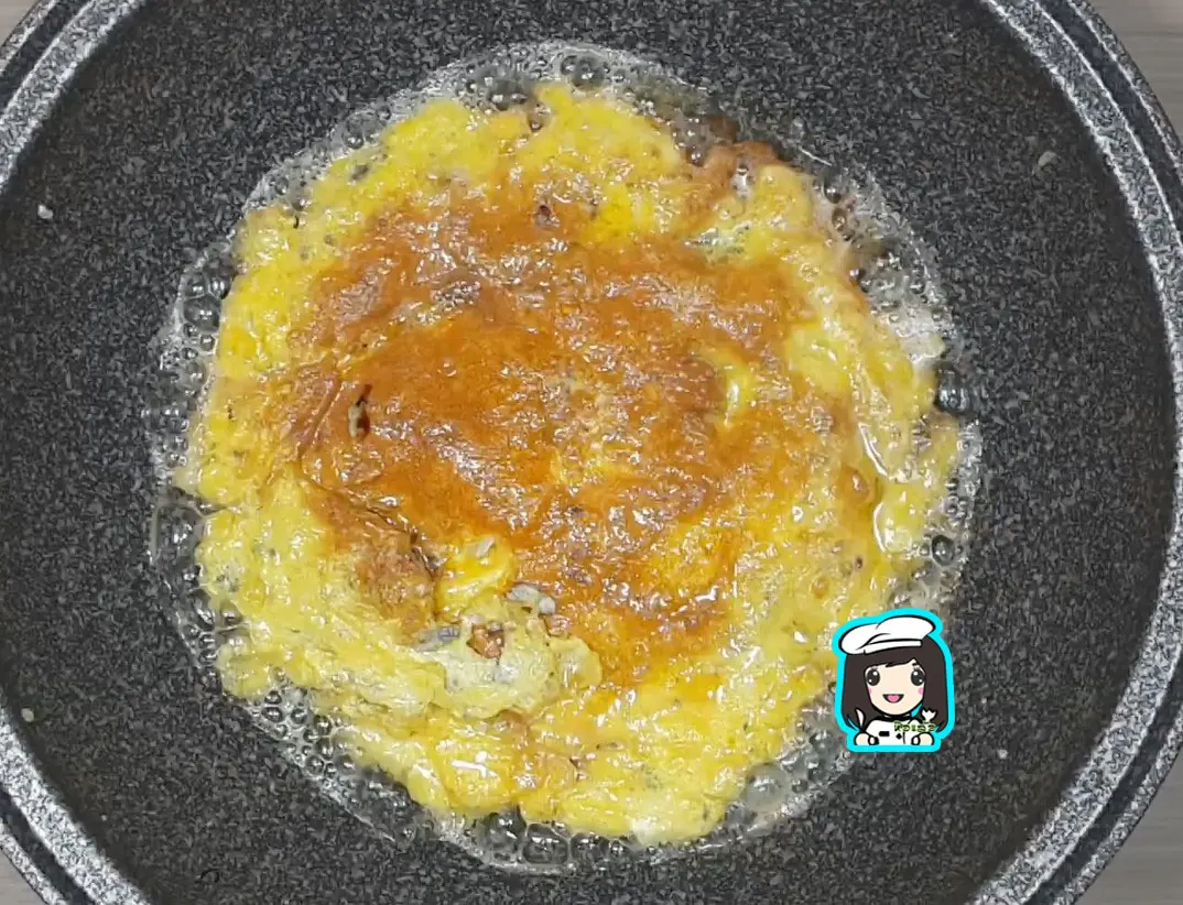 กลับไข่ด้านบนลงทอดให้เหลืองกรอบทั้ง 2 ด้าน ตักขึ้นพักให้สะเด็ดน้ำมัน