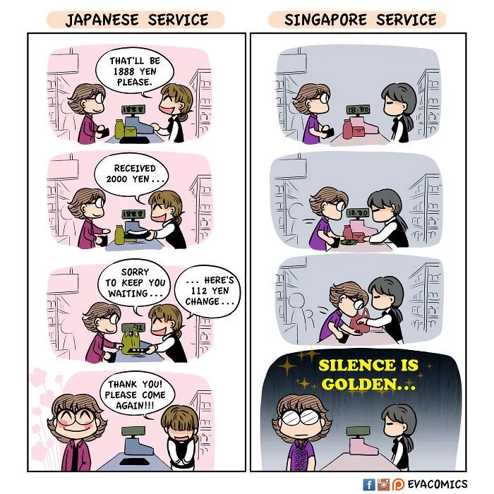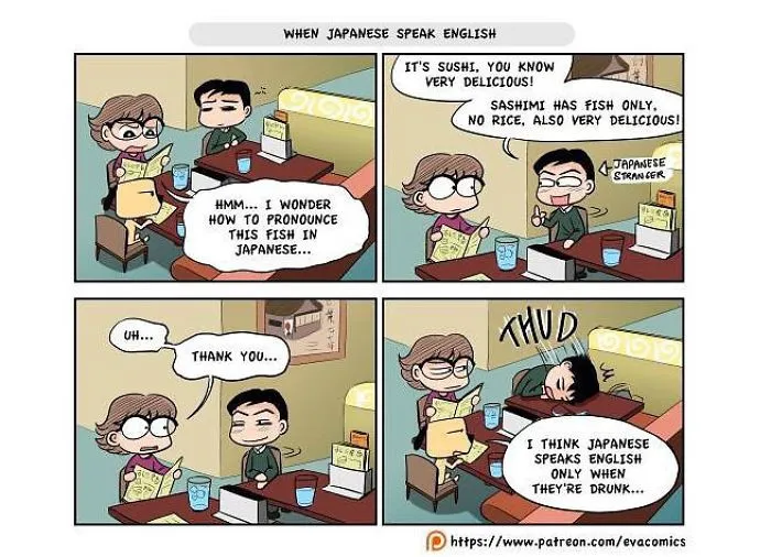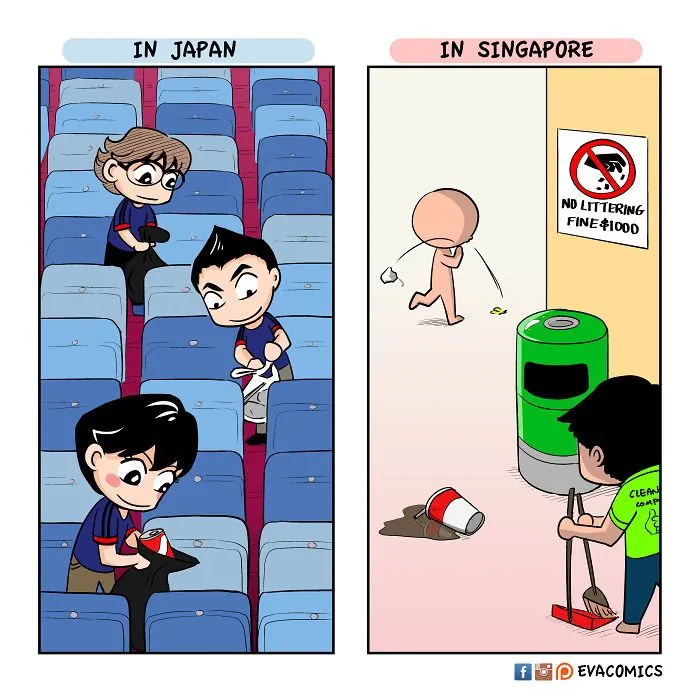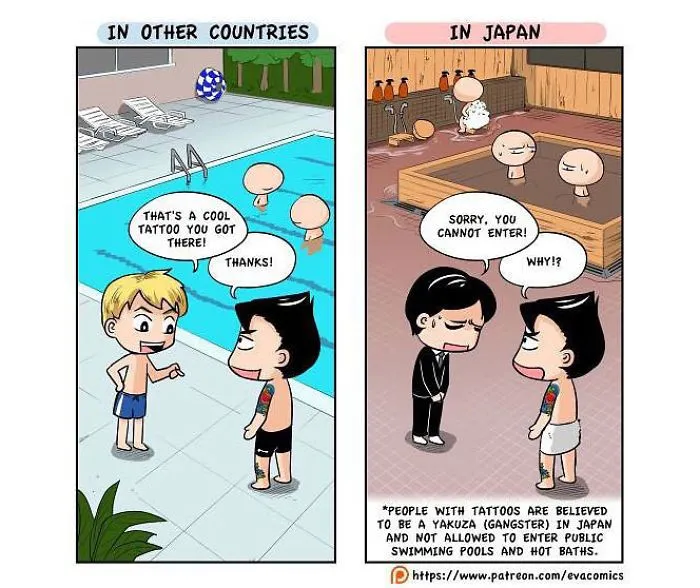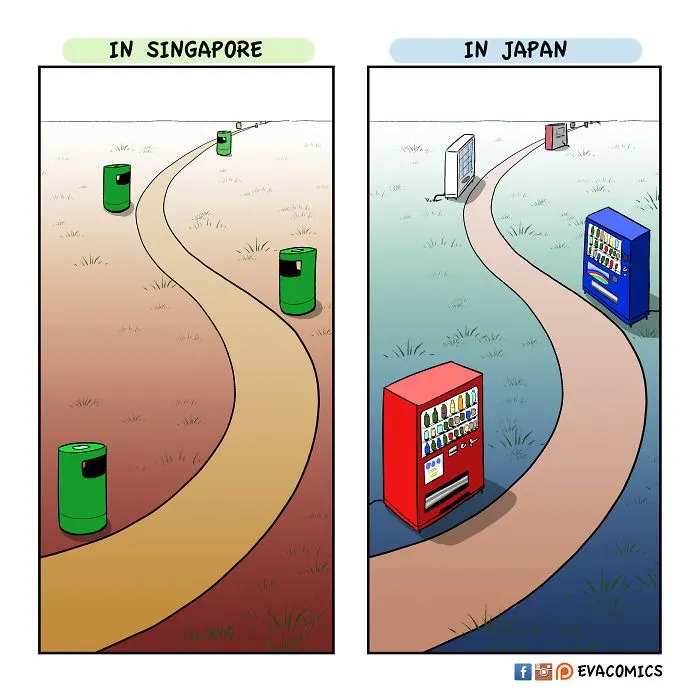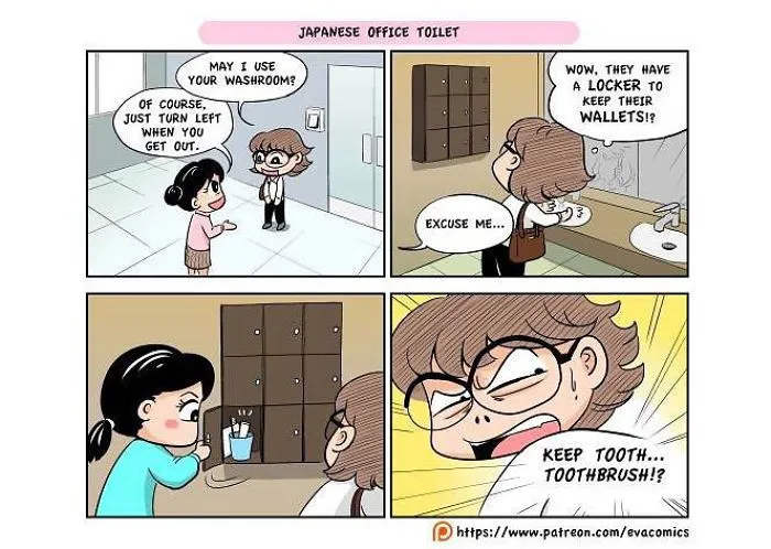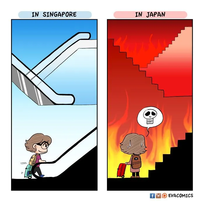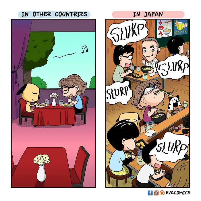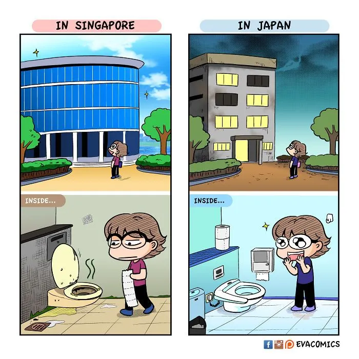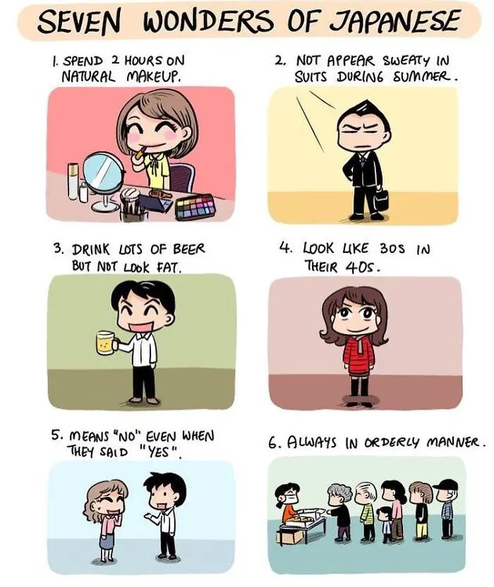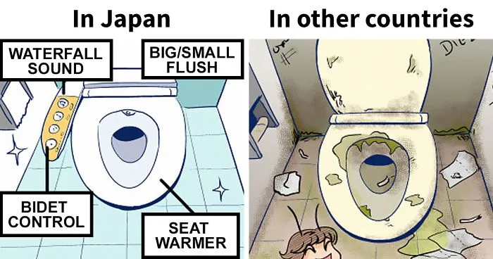 นักศึกษาต่างชาติคนหนึ่งที่ได้ศึกษาในมหาลัยในกรุงโตเกืยวในช่วงปี 2010 ถึง 2014 ได้สังเกตุเห็นความแตกต่างทางวัฒนธรรมมากมาย ระหว่าง ญี่ปุ่น และ ประเทศของเขา และ เขาได้วาดการ์ตูนเปรืยบเทืยบวัฒนธรรมของ ญี่ปุ่น และ ประเทศของเขา ครับ.