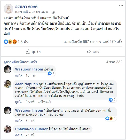 “จะหักมุมชีวิต? แต่กลับโยนความผิดให้ “หนู” คุณ “ล” คะ คิดจะคบก็กล้าสิคะ อย่าเป็นอีแอบค่ะ มันเป็นเรื่องที่น่าอายและบาปค่ะ ที่โยนความผิดให้คนอื่นเนียนๆ ให้ตกเป็นจำเลยสังคม ใจคุณทำด้วยอะไรคะ!!”
