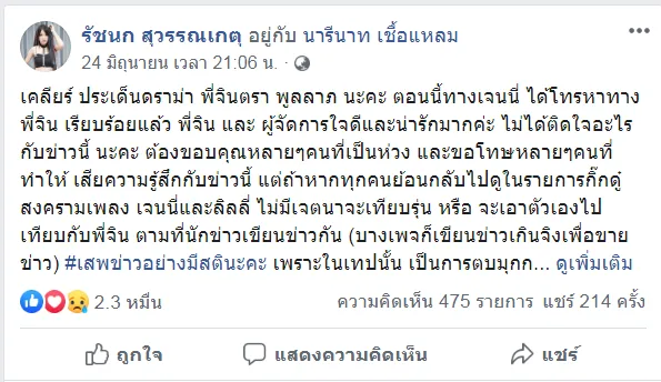 รัชนก สุวรรณเกตุ หรือเจนนี่ เจ้าของค่ายเพลง ได้หมดถ้าสดชื่น โพสต์ในเฟสบุค กับเรื่องราจากข่าว กรณีดราม่า ลิลลี่-เจนนี่ เลิกคุยทั้งอำเภอ แซวตลกพาดพิงหน้าตา ทรงผมhttps://board.postjung.com/1152635 มีข้อความว่า...........