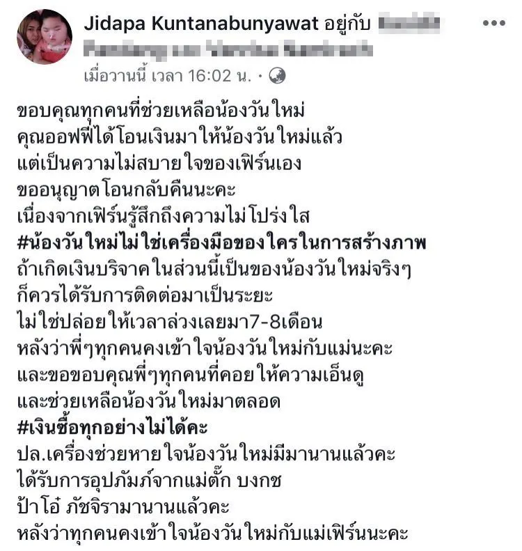 "ขอบคุณทุกคนที่ช่วยเหลือน้องวันใหม่ คุณออฟฟี่ได้โอนเงินมาให้น้องวันใหม่แล้ว แต่เป็นความไม่สบายใจของเฟิร์นเอง ขออนุญาตโอนกลับคืนนะคะ เนื่องจากเฟิร์นรู้สึกถึงความไม่โปร่งใส #น้องวันใหม่ไม่ใช่เครื่องมือของใครในการสร้างภาพ ถ้าเกิดเงินบริจาคในส่วนนี้เป็นของน้องวันใหม่จริงๆ ก็ควรได้รับการติดต่อมาเป็นระยะ ไม่ใช่ปล่อยให้เวลาล่วงเลยมา 7 - 8เดือน หลังว่าพี่ๆทุกคนคงเข้าใจน้องวันใหม่กับแม่นะคะ และขอขอบคุณพี่ๆทุกคนที่คอยให้ความเอ็นดู และช่วยเหลือน้องวันใหม่มาตลอด #เงินซื้อทุกอย่างไม่ได้คะ ปล.เครื่องช่วยหายใจน้องวันใหม่มีมานานแล้วคะ ได้รับการอุปภัมภ์จากแม่ตั๊ก บงกช ป้าโอ๋ ภัชจิรา มานานแล้วคะ หลังว่าทุกคนคงเข้าใจน้องวันใหม่กับแม่เฟิร์นนะคะ"