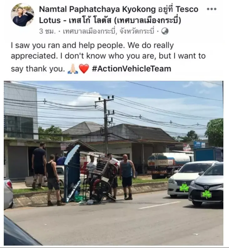 ข้างรถตู้เขียนข้อความว่า Action Vehicle Team ก่อนที่กลุ่มนักท่องเที่ยวกลุ่มนั้น จะวิ่งลงมาและเข้าไปช่วยเหลือ ตนถ่ายภาพไว้ได้ จึงนำภาพมาโพสต์ลงชื่นชมในความมีน้ำใจ ก็มีคนเข้ามาแสดงความคิดเห็นชื่นชม