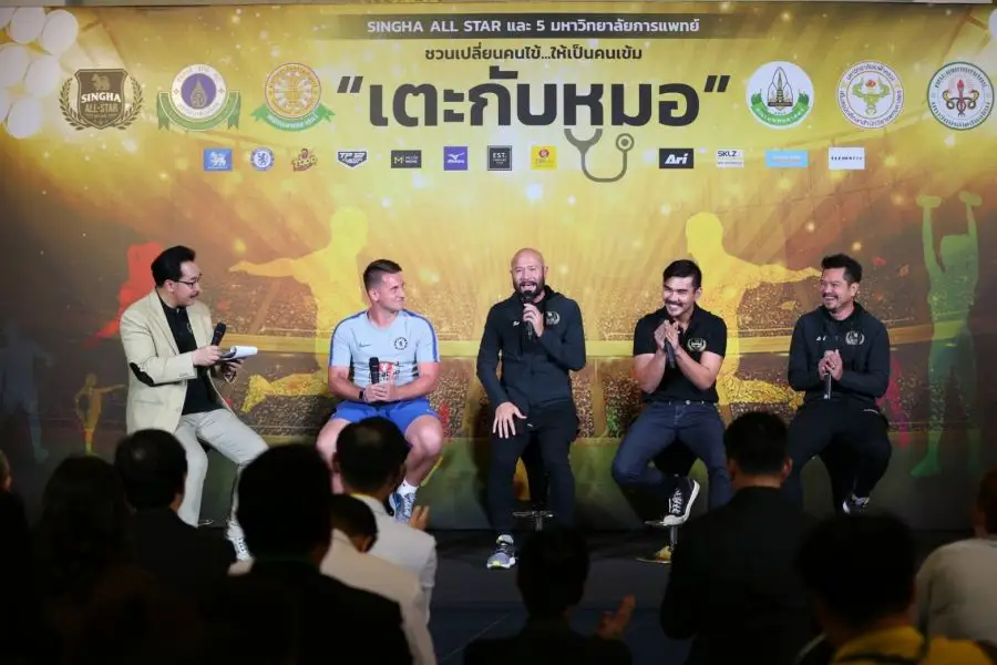 เต๋า สมชาย, หนุ่ม ศรราม, จอห์น บราโว่, สงกรานต์ เดอะวอยซ์ ตัวแทนจาก ทีมสิงห์ออลสตาร์ ร่วมพูดคุยถึงโครงการ "เตะกับหมอ" โดย บริษัท สิงห์ คอร์เปอเรชั่น จำกัด ได้จัดงานแถลงข่าว “ฟุตบอลรวมดารา สิงห์ออลสตาร์ 2019” ณ หอประชุมเล็ก บริษัท บุญรอดบริวเวอรี่ จำกัด (สำนักงานใหญ่) ซึ่งการแข่งขันฟุตบอลนัดพิเศษ โดย ทีม SINGHA ALL-STAR TEAM 2019 ร่วมกับ คณะแพทย์จากมหาวิทยาลัยต่างๆ กับภารกิจ “เปลี่ยนคนไข้ให้เป็นคนเข้ม” เพื่อส่งเสริมให้คนรักสุขภาพหันมาออกกำลังกาย และนำเงินบริจาคไปปรับปรุงสวนสุขภาพ และ สนามเด็กเล่น ร่วมกับ ทีมสิงห์ออลสตาร์