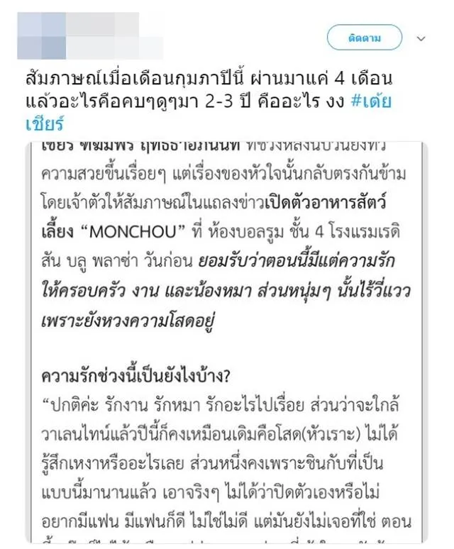 ทั้งหมดนี้ ทำให้แฟนคลับหลายคนถึงกับงงไปตามกัน เพราะ 4 เดือนที่แล้วยังบอกโสดสนิท ไม่มีใครจีบ แต่สัมภาษณ์ล่าสุดบอกไฮโซบิ๊ก ทำดีด้วยมาตลอด 2 ปีที่ผ่านมา หลายคนจึงรู้สึกผิดหวังโดยเฉพาะเหล่าลูกหมี ที่ติดตามคู่จิ้น พ่อหมี – แม่หมี มานานกว่า 3 ปี