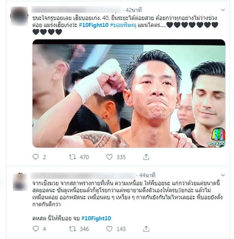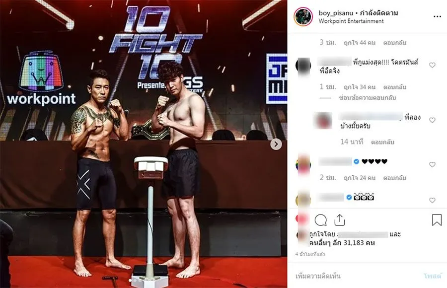 เรียกว่ามวยจบคนไม่จบจริงๆ สำหรับมวยคู่กระแส ทอล์ค ออฟ เดอะ ทาวน์ ของพิธีหนุ่ม “บอย พิษณุ นิ่มสกุล” เพื่อนสนิทของ ต้นหอม-ศกุนตลา ขึ้นชกปะทะกับดาราหนุ่ม “ซัน ประชากร” อดีตหวานใจต้นหอม บนสังเวียนจริงในรายการ 10Fight10 ซึ่งชกไปเมื่อวานนี้(1ก.ค.62) โดยผลตัดสินออกมาว่าหนุ่มซันมีคะแนนรวมชนะอีกฝ่าย
