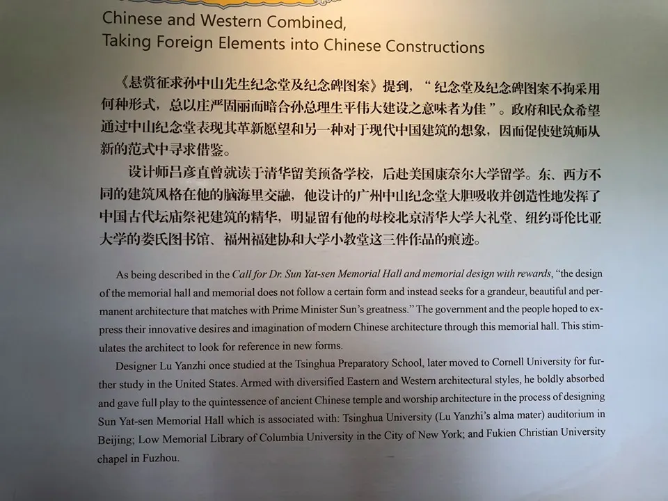 ดร.ซุน ยัตเซ็น เป็นผู้นำการปฏิรูปประเทศที่คนจีนให้ความนับถือมาก เมื่อเข้ามาในบริเวณอนุสรณ์สถานก็จะมองเห็นรูปปั้นบรอนซ์ของ ดร.ซุน ยัตเซ็น ขนาดสูง 5.5 เมตร ตั้งตระหง่านอยู่บนฐานที่ทำจากหินแกรนิตอยู่ด้านหน้าอาคารทรงแปดเหลี่ยมซึ่งเป็นรูปทรงของพระราชวังโบราณที่ทาสีน้ำเงินและสีแดงเป็นหลัก ตรงกลางของอาคารจะมีกระดานจารึกอักษรสี่ตัวที่มีความหมายว่า “โลกทั้งใบรวมกันเป็นชุมชนหนึ่งเดียว” ภายในตัวอาคารมีการจัดแสดงสิ่งของต่างๆ ที่เกี่ยวข้องกับ ดร.ซุน ยัตเซ็น อีกด้วย